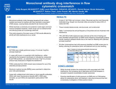 Conclusion: While rituximab remains the predominant mAb associated with FXM interference, the increasing use of alternative anti-B cell therapies in transplant recipients necessitates broader awareness. Proactive identification of mAb exposure via EMR prior to FXM testing allows for preemptive donor cell treatment, reducing turnaround time and unnecessary investigation of false-positive results.