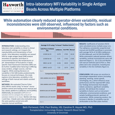 Methods: We evaluated SAB results from an “in-house” source positive control sera across manual methods and two robotic platforms (LabXpress and HLAPRO). Coefficients of variation (%CV) were calculated across multiple assay runs for each bead using Thermo Fisher, One Lambda LS1A04, LS2A01, and MICA beads. Additionally, we assessed %CV for SAB results using Werfen LSA Class 1 and Class 2 beads run manually using the same positive control sera.