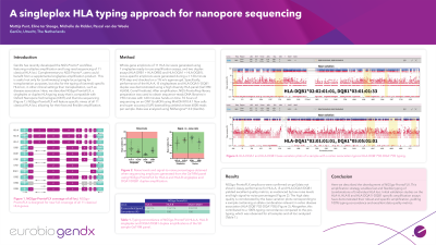Aim: Long read sequencing technologies are increasingly employed by HLA laboratories. In the field of transplantation diagnostics, multiplex assays are most prevalent in analyzing multiple HLA loci at high efficiency. However, specific HLA loci are increasingly associated with various diseases, resulting in an increased interest in (single locus) HLA typing for disease association testing and companion diagnostics (CDx) purposes. To facilitate this, we are developing whole gene singleplex HLA typing assays for nanopore sequencing, consisting of 10different assays to amplify 11 HLA genes. The combination of single gene amplification and nanopore sequencing, allows for flexible and fast typing results. Amplicons generated with the singleplex assays can be combined with the NGS-Pronto® workflow, introducing flexibility in sequencing of samples and loci.