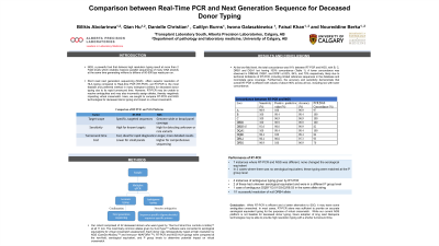 Results: At the two-field level, total concordance was 91% between RT-PCR and NGS, with B, C, DRB1 and DQA1 loci having 100% concordance (Table 1).A lower concordance was observed in DRB345, DQB1, and DPB1 at 82%, 84%, and 70% respectively, likely due to technical limitations of RT-PCR, including incomplete gene coverage. Accuracy and sensitivity demonstrate that RT-PCR is efficient with values of above 90% across all loci, including loci with lower concordance.Of the 7 instances where two-field typing was different between RT-PCR and NGS, none changed the serological equivalent,or in cases with no serological equivalent, typings were matched at the P group level.Thus, RT-PCR results are unlikely to negatively affect the accuracy of virtual crossmatch. Also, there were 4 instances of ambiguous typing;2 of which had unknown serological equivalents and were in a different P group, and one had DQB1*03/01/03:02/06:03 in a string.Lastly,the only null allele found was at DRB4 locus and was accurately resolved by RT-PCR.