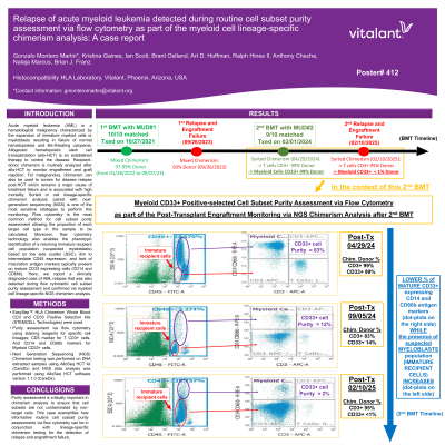 Body: Acute myeloid leukemia (AML) is a hematological malignancy characterized by the expansion of immature myeloid cells or myeloblasts resulting in failure of normal hematopoiesis and life-threating cytopenia. Allogeneic hematopoietic stem cell transplantation (allo-HCT) is an established therapy to control the disease. Recipient-donor chimerism is routinely analyzed after allo-HCT to monitor engraftment and graft rejection. For malignancies, chimerism can also be used to screen for disease relapse post-HCT which remains a major cause of treatment failure and is associated with high mortality. Sorted or cell lineage-specific chimerism analysis paired with next-generation sequencing (NGS) is one of the most sensitive strategies to perform this monitoring. Flow cytometry is the most common method for cell subset purity assessment allowing the proportion of each target cell type in the sample to be calculated. Moreover, flow cytometry technology also enables the phenotypic identification of an abnormal myeloblast population based on the typically observed low side scatter (SSC) and dim to intermediate CD45 expression in addition to an evaluation of antigen expression profile, since myeloblasts often differ from mature cells by expressing immature markers and lacking antigens typically present on mature cells. Here, we report a clinically diagnosed case of AML relapse that was also detected based on the flow cytometric cell subset purity assessment and phenotypic characteristics displayed overtime post-HCT (increased majority of CD33 positively selected myeloid cells from peripheral blood showing lower levels of CD14/CD66b mature cells markers based on staining antibodies used), while occurring this in conjunction with the impending failure of engraftment quantified via myeloid cell lineage-specific NGS chimerism analysis.
