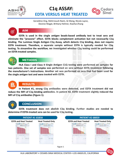 Aim: EDTA is used in the single antigen beads-based antibody test to treat sera and eliminate the “prozone” effect. EDTA blocks complement activation but not necessarily C1q binding. The Luminex Single Antigen C1Q Assay, which detects C1q binding, does not require EDTA treatment. Therefore, a separate sample without EDTA is typically needed for C1q testing. To streamline the workflow, we investigated whether C1q testing could be performed on EDTA-treated samples.