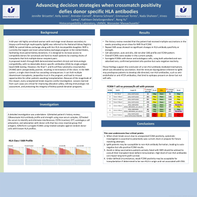 Body: A highly sensitized 60-year-old woman with end-stage renal disease due to biopsy-confirmed IgA nephropathy (IgAN) was referred to the National Kidney Registry (NKR) for paired kidney exchange along with her HLA-incompatible daughter. A proposed match through NKR showed excellent clinical and immunologic compatibility with no detectable DSA by SAB assay. However, the final T and B cell FCXM was unexpectedly positive, prompting chain termination. Because chain breaks in NKR carry a significant negative impact, a detailed investigation was undertaken: 1)Detailed patient’s history review 2)Reevaluate HLA antibody profile and strength using new serum samples 3)Treated the serum to identify and eliminate interferences: EDTA (routine), DTT, autologous cell adsorption, and adsorption with donor cells that have cross-reactive group HLA antigens 4)Performed surrogate FCXMs using treated samples against random donor cells with known HLA profiles.