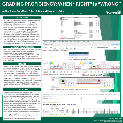 Body: All accredited histocompatibility laboratories are required to participate in proficiency testing (PT). HLA typing proficiency results are graded based on consensus and are considered good, acceptable, unacceptable, or ungraded. One reason why consensus is not always reached is that different typing platforms (e.g., SSO, RT- PCR, NGS, nanopore sequencing) and reporting strategies (G and P groups vs specific alleles) are used by the participating laboratories. This report highlights an instance of DPB1 reporting variability identified when a PT challenge, previously tested by RT-PCR, was re-tested during the validation phase of the Oxford Nanopore (ONT) sequencing platform. Testing by ONT revealed that long-read, whole genome sequencing provides a more accurate assessment of HLA alleles than other testing platforms.