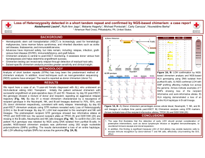 Body: We report here a case of an 11-year-old female diagnosed with ALL who underwent an HLA-identical sibling Hematopoietic stem cell transplantation (HSCT). Initially the patient achieved 100% donor chimerism with successful engraftment at post-operative days 23 and 50. However, by day 63 post-HSCT, the genotype showed a mixture of donor and recipient, signaling an aggressive relapse trajectory. By day 91 a mixed chimerism characterized by a resurgence of recipient genotype in the neutrophil, NK, and B-cell lineages declined to 70%, 50%, and 2% donor chimerism (Fig.1A), consistent with early relapse. Interestingly, by day 63 post-HCT chimerism analysis using short tandem repeat (STR) markers revealed early Loss of Heterozygosity (LOH) in the B-cell lineage. By day 91, LOH had expanded to the neutrophil and NK cell lineages. The pretransplant recipient STR genotype showed two informative alleles at TPOX and D2S1338 loci; the second recipient allele at TPOX (9) and D2S1338 (20) are missing in the B-cells, Neutrophils and NK cells lineages (Fig. 1B). To confirm the LOH, the patient HLA genotype was retested by NGS using DNA isolated from purified B-cells. In parallel, NGS-based chimerism analysis was performed using 202 single nucleotide polymorphisms (SNPs) profiling. The results demonstrated a loss of an entire haplotype, with LOH affecting multiple SNPs loci across the genome (Fig. 2A, B). These findings support the presence of LOH and further validate the chimerism results. This is significant because LOH of HLA alleles may enable leukemic cells to escape immune recognition by donor-derived T and NK cells, effectively circumventing the graft-versus-leukemia (GVL) effect. The patient ultimately experienced ALL relapse and succumbed to disease progression five months post-transplant.