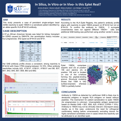 Body: Highly sensitized patients awaiting solid organ transplantation face extra challenges from false positive reactivities against denatured antigens on bead-based assays. We report a case of discrepant single-antigen bead (SAB) reactivity to eplet 156DA in a sensitized patient. A 57-yo African American patient diagnosed with type II diabetes mellitus and hypertension is listed for a kidney transplant. Her sensitization history includes 4 pregnancies. She was typed as B44 (B*44:03) and B51. Her SAB antibody profile shows a consistent, strong reactivity to B*44:02 with class I PRA ranging between 10-15% (Fig. 1A). Other antibody reactivities include A25, A*34:01, A*66:01, A*68:01 and B8, B37, B41, B42, B45, B57, B58, B63 and B82. According to the HLA Eplet Registry, this antibody profile aligns with reactivity to the eplet 156DA present on B*44:02 but absent from the patient’s own B*44:03 (Fig. 1B). To confirm, SAB testing with reagents from an alternative vendor was performed but failed to reproduce the 156DA pattern reactivity. Surrogate flow crossmatches against three 156DA+ donors (2 B*44:02, 1 B8) were consistently negative (Fig. 1C). Eplet 156DA comprises aspartic acid (D) at position 156 and alanine (A) at position 158 and is located on one of the α-helices forming the peptide-binding groove (Fig. 1D). Structural modeling shows that 158A is fully surface-exposed, whereas 156D is partially buried. According to the Eplet Registry 156DA is a confirmed, highly exposed eplet. However, the discrepant assay results between the SAB reagents and the cell-based flow crossmatches suggest that the 156DA reactivity observed with one of the SAB reagents may reflect nonspecific binding to denatured antigen epitopes.