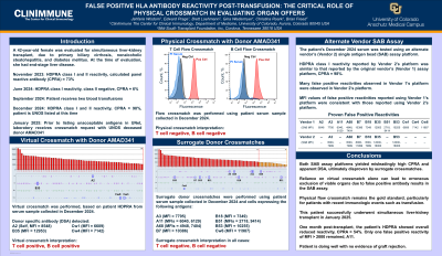 Body: A 42-year-old female was evaluated for simultaneous liver-kidney (SLK) transplant due to primary biliary cirrhosis, nonalcoholic steatohepatitis, and diabetes mellitus. At the time of evaluation, she had end-stage liver disease. Initial HLA antibody testing in November 2023 revealed Class I and II reactivity with a calculated panel reactive antibody (cPRA) of 73%, using the One Lambda single antigen bead (SAB) assay. Follow-up testing in June 2024 showed only Class I reactivity, with a reduced cPRA of 6%. The LabScreen Mixed Beads assay was negative for both Class I and II antibodies. In December 2024, a new sample tested positive for Class I reactivity on the LabScreen Mixed Beads. Reflex SAB testing identified Class I and II reactivity with a cPRA of 97.9%. The patient reported having received two blood transfusions in September 2024. An SLK offer from a DCD donor was received in January 2025 prior to listing any unacceptable antigens in UNET. Unexpectedly, the physical crossmatch, using the December 2024 sample, was T and B cell negative, despite the presence of defined donor-specific antibodies (DSA) to B35 (MFI = 12,953), Cw1 (MFI = 6,609), and Cw4 (MFI = 7,142). Surrogate crossmatches with donors expressing these antigens identified in the SAB assay were also negative indicating false positive antibody reactivity. Surprisingly, we identified nine additional false positive Class I reactivities using surrogate donor crossmatches. To further investigate, the December 2024 sample was tested externally using Werfen’s SAB assay, which confirmed Class I reactivity and a cPRA of 98%. The same false positive pattern observed in the One Lambda SAB assay was present, reinforcing the limitations of bead-based assays. The patient successfully underwent SLK transplant in January 2025. Patient is doing well post-transplant with no concern of graft rejection.