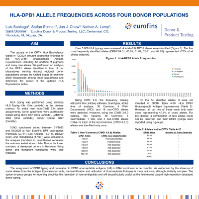 Aim: The update to the OPTN HLA Equivalency tables in 12/2024 brought substantial changes to the HLA-DPB1 Unacceptable Antigen Equivalences, including the addition of p-groups and many rare alleles. We performed an analysis of the DPB1 alleles identified in four of our laboratories serving distinct regional donor populations across the United States to examine allele frequencies among these populations and determine the impact of the updated HLA Equivalence tables.