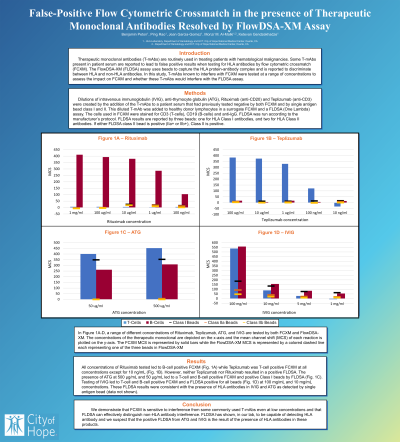 Conclusion: We demonstrate that FCXM is sensitive to interference from some commonly used T-mAbs even at low concentrations and that FLDSA can effectively distinguish non-HLA antibody interference. FLDSA has shown, in our lab, to be capable of detecting HLA antibody and we suspect that the positive FLDSA from ATG and IVIG is the result of the presence of HLA antibodies in these products.
